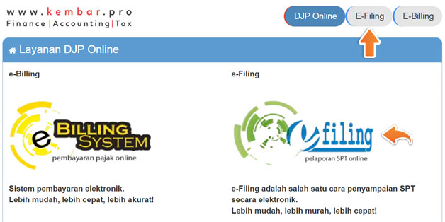 Para wajib pajak badan mulai dapat menggunakan fasilitas e-form untuk melaporkan pajaknya melalui situs web milik pemerintah, dalam hal ini dengan mengakses laman DJP Online. Baik e-Filing dan e-form mempunyai kedudukan yang sama dalam rangka menyediakan fasilitas pelaporan SPT, perbedaan mendasar keduanya adalah dalam hal pengaksesan jaringan internet. Electronic Filing e-Filing adalah suatu cara penyampaian Surat Pemberitahuan (SPT) secara elektronik yang dilakukan secara online dan real time melalui internet pada website Direktorat Jenderal Pajak (http://www.pajak.go.id) atau Penyedia Jasa Aplikasi Perpajakan (PJAP).